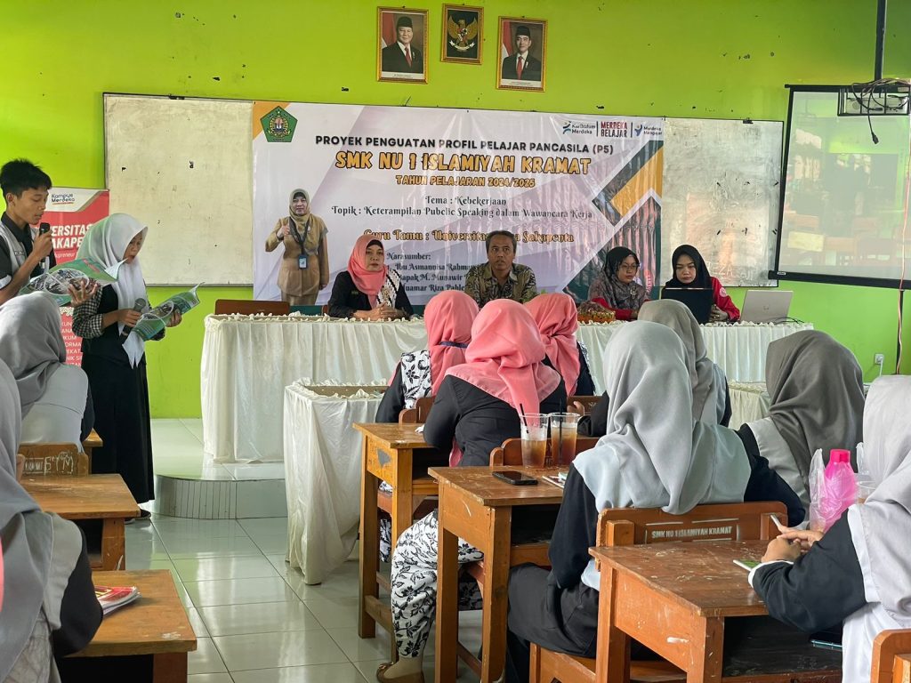 Tegal, 15 Mei 2025 ā Dalam rangka membekali siswa dengan keterampilan menghadapi dunia kerja, SMK NU 1 Islamiyah Kramat menyelenggarakan kegiatan Proyek Penguatan Profil Pelajar Pancasila dengan tema “Public Speaking dan Kemampuan Interview di Dunia Kerja”, yang berlangsung pada Kamis, 15 Mei 2025. Kegiatan ini menghadirkan narasumber professional dari Universitas BIMA SAKAPENTA dan diikuti oleh 292 siswa dari jurusan Akuntansi, Teknik Komputer dan Jaringan (TKJ), serta Teknik Kendaraan Ringan (TKR). Tiga narasumber utama yang hadir dalam kegiatan ini adalah Asmannisa Rahmawati, M.Ak., Desi Maola Ayu, S.E., M.M., dan Muamar Riza Pahlevi, M.H., yang masing-masing memberikan materi seputar keterampilan berbicara di depan umum, teknik menghadapi wawancara kerja, serta etika dan kesiapan mental dalam memasuki dunia profesional.